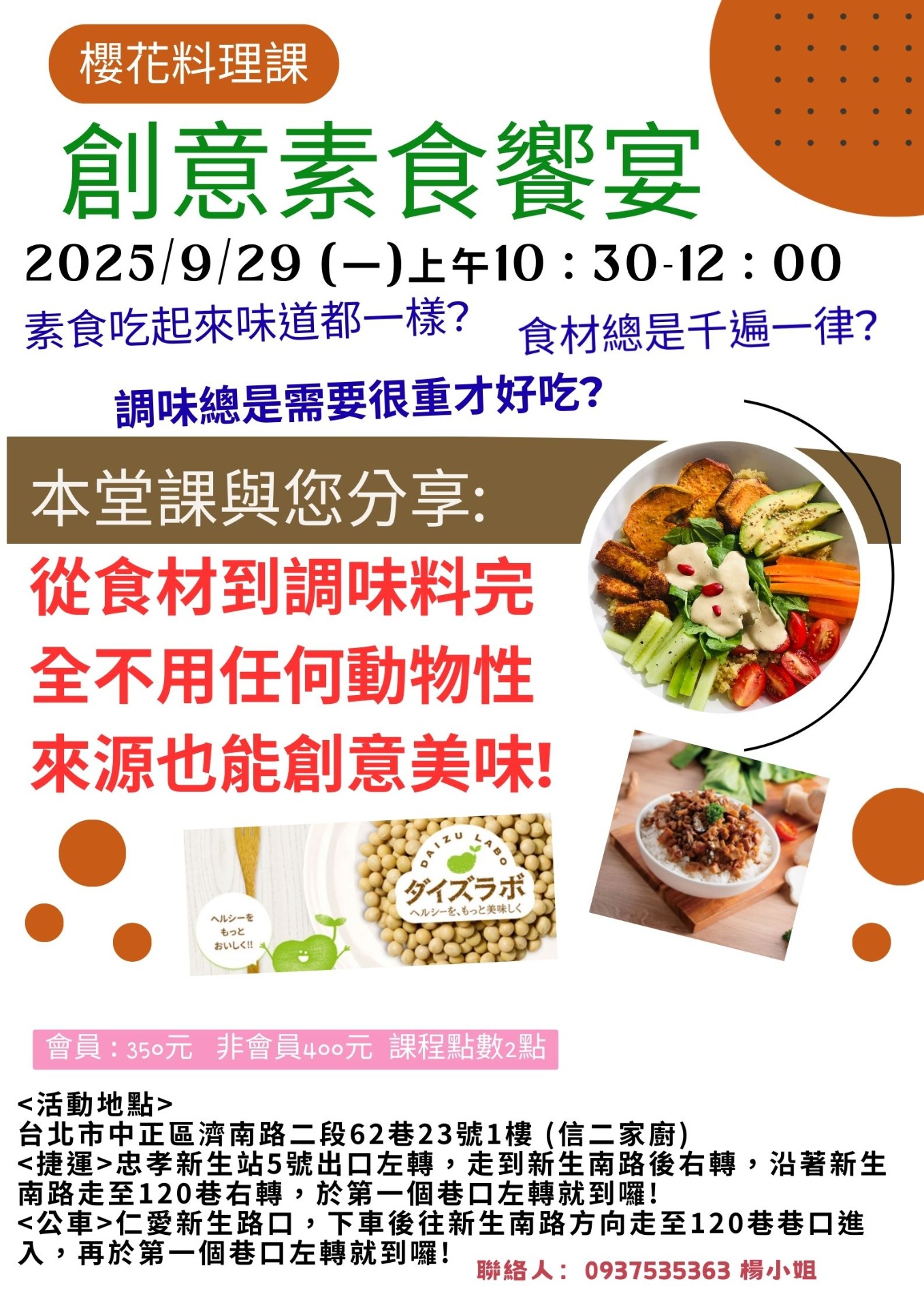 9/29 櫻花料理課-從食材到調味料,全素食饗宴!