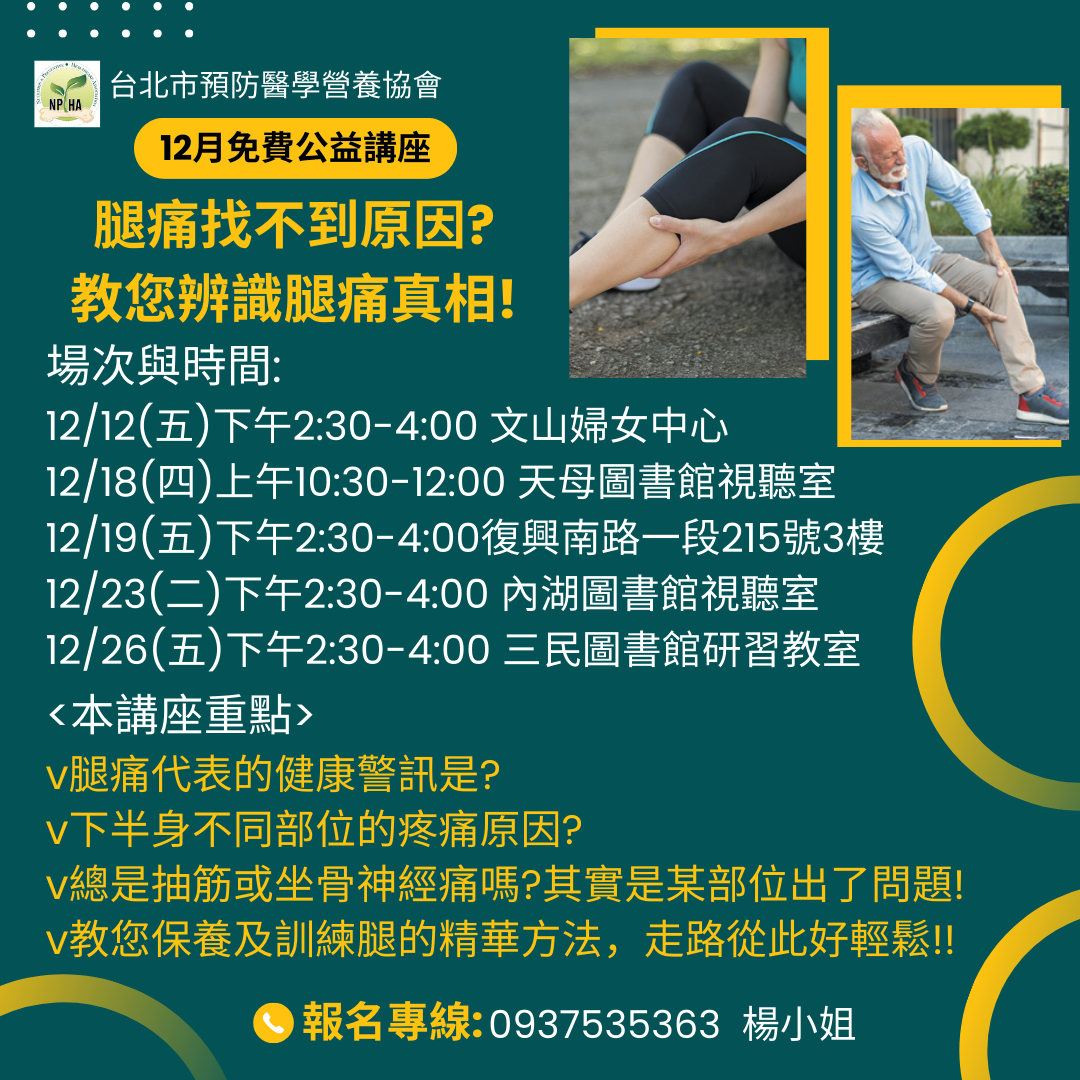 12月免費公益講座-腿痛找不到原因?教您辨識腿痛真相,走路更輕鬆!!